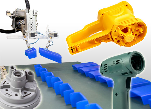 Spritzgießmaschinen mit Aufspannmaßen bis 700 mm x 700 mm und einer maximalen Schließkraft bis 3000 kN ermöglichen die Teileproduktion bis ca. 750 g.